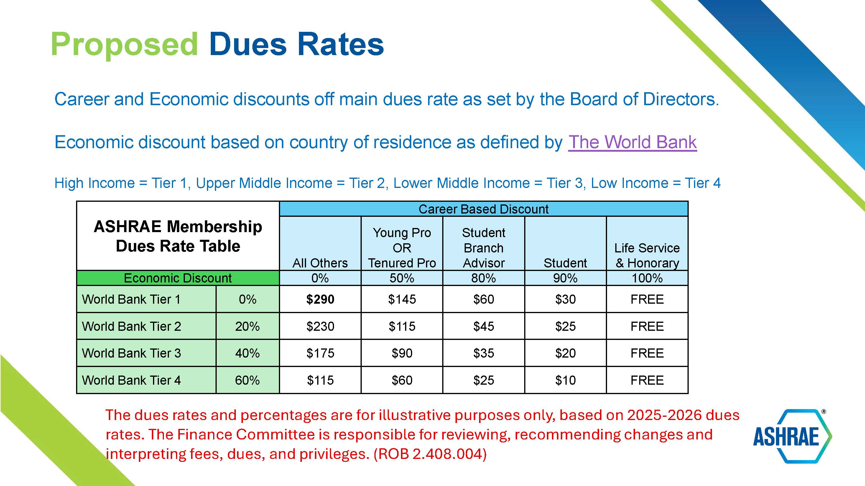 The "Full Member" grade features a tiered dues structure based on the four economic tiers outlined by The World Bank with broader qualifications and the same benefits across all tiers. In the current membership model, Full Members (members from Tier 1 and Tier 2 countries) pay the advertised dues rate and members that fall into the Developing Economies discount program (members from Tier 3 and Tier 4 countries) pay a discounted dues rate. The four tiers will align directly with the four income groups as defined by The World Bank.